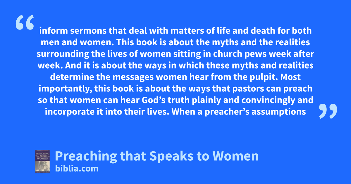 inform sermons that deal with matters of life and death for both men and women. This book is about the myths and the realities surrounding the lives of women sitting in church pews week after week. And it is about the ways in which these myths and realities determine the messages women hear from the pulpit. Most importantly, this book is about the ways that pastors can preach so that women can hear God’s truth plainly and convincingly and incorporate it into their lives. When a preacher’s assumptions