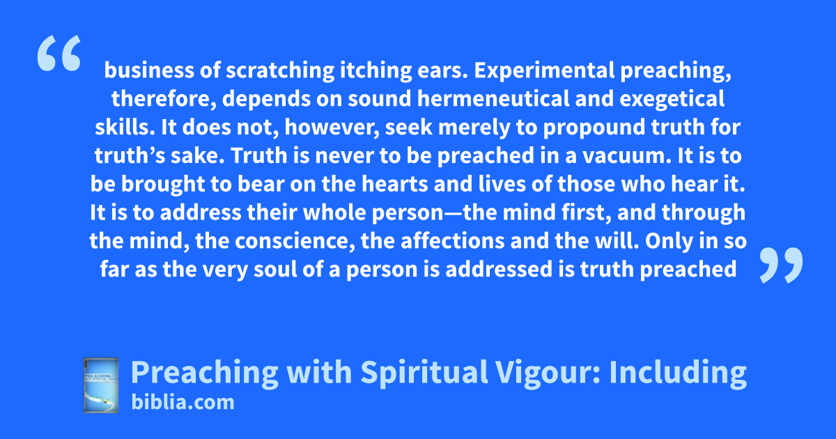 business of scratching itching ears. Experimental preaching, therefore, depends on sound hermeneutical and exegetical skills. It does not, however, seek merely to propound truth for truth’s sake. Truth is never to be preached in a vacuum. It is to be brought to bear on the hearts and lives of those who hear it. It is to address their whole person—the mind first, and through the mind, the conscience, the affections and the will. Only in so far as the very soul of a person is addressed is truth preached