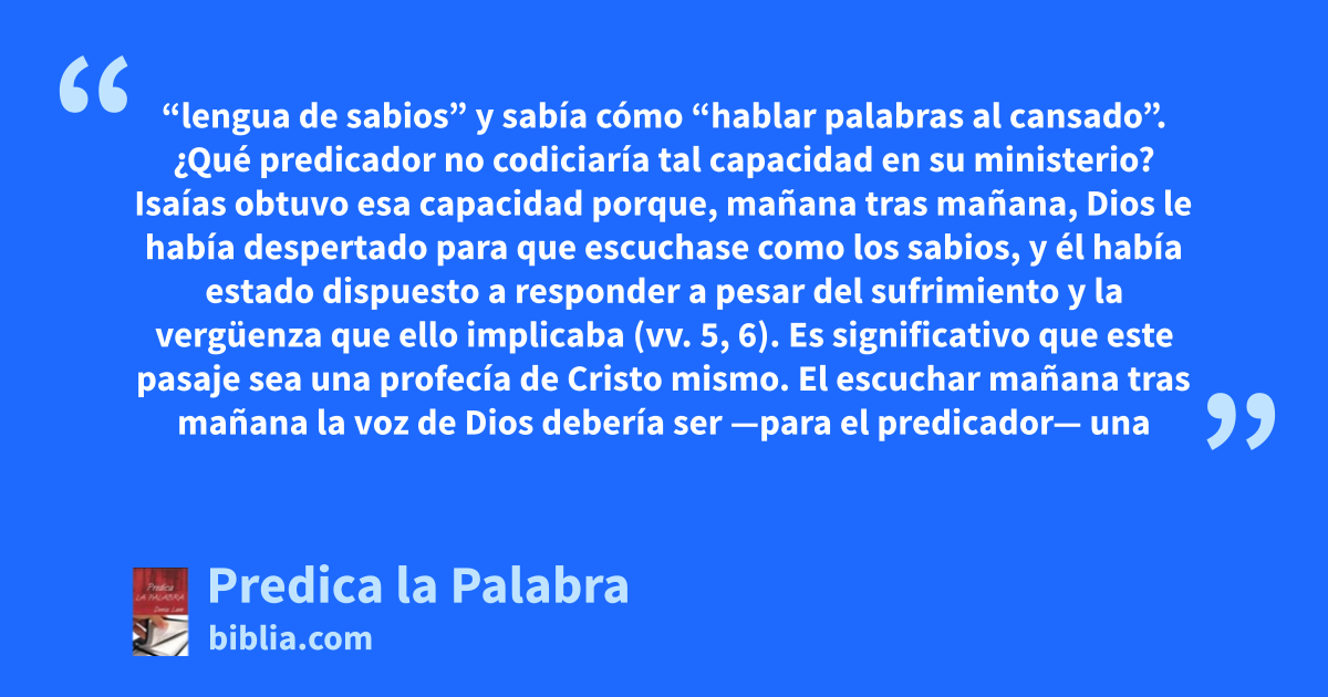 “lengua de sabios” y sabía cómo “hablar palabras al cansado”. ¿Qué predicador no codiciaría tal capacidad en su ministerio? Isaías obtuvo esa capacidad porque, mañana tras mañana, Dios le había despertado para que escuchase como los sabios, y él había estado dispuesto a responder a pesar del sufrimiento y la vergüenza que ello implicaba (vv. 5, 6). Es significativo que este pasaje sea una profecía de Cristo mismo. El escuchar mañana tras mañana la voz de Dios debería ser —para el predicador— una