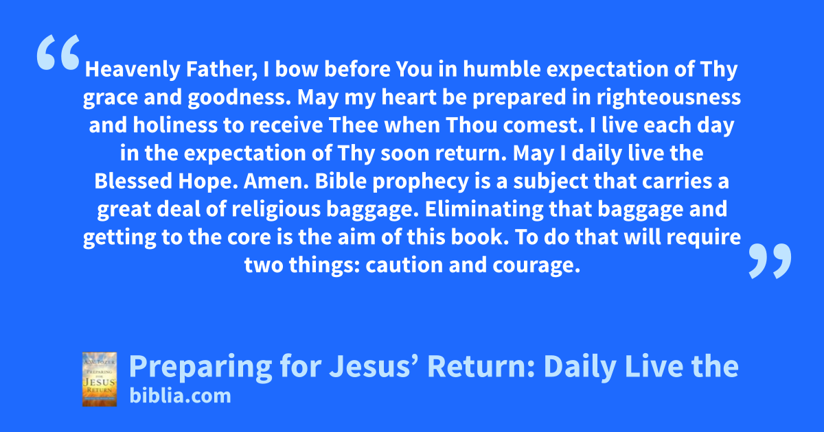 Heavenly Father, I bow before You in humble expectation of Thy grace and goodness. May my heart be prepared in righteousness and holiness to receive Thee when Thou comest. I live each day in the expectation of Thy soon return. May I daily live the Blessed Hope. Amen. Bible prophecy is a subject that carries a great deal of religious baggage. Eliminating that baggage and getting to the core is the aim of this book. To do that will require two things: caution and courage.