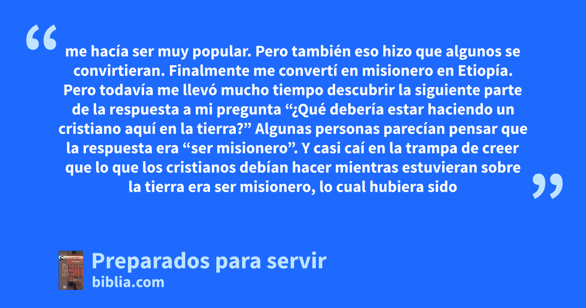 me hacía ser muy popular. Pero también eso hizo que algunos se convirtieran. Finalmente me convertí en misionero en Etiopía. Pero todavía me llevó mucho tiempo descubrir la siguiente parte de la respuesta a mi pregunta “¿Qué debería estar haciendo un cristiano aquí en la tierra?” Algunas personas parecían pensar que la respuesta era “ser misionero”. Y casi caí en la trampa de creer que lo que los cristianos debían hacer mientras estuvieran sobre la tierra era ser misionero, lo cual hubiera sido