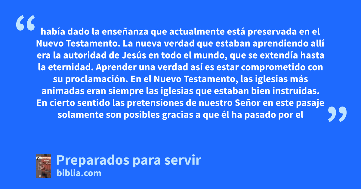 había dado la enseñanza que actualmente está preservada en el Nuevo Testamento. La nueva verdad que estaban aprendiendo allí era la autoridad de Jesús en todo el mundo, que se extendía hasta la eternidad. Aprender una verdad así es estar comprometido con su proclamación. En el Nuevo Testamento, las iglesias más animadas eran siempre las iglesias que estaban bien instruidas. En cierto sentido las pretensiones de nuestro Señor en este pasaje solamente son posibles gracias a que él ha pasado por el