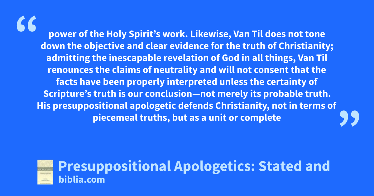 power of the Holy Spirit’s work. Likewise, Van Til does not tone down the objective and clear evidence for the truth of Christianity; admitting the inescapable revelation of God in all things, Van Til renounces the claims of neutrality and will not consent that the facts have been properly interpreted unless the certainty of Scripture’s truth is our conclusion—not merely its probable truth. His presuppositional apologetic defends Christianity, not in terms of piecemeal truths, but as a unit or complete