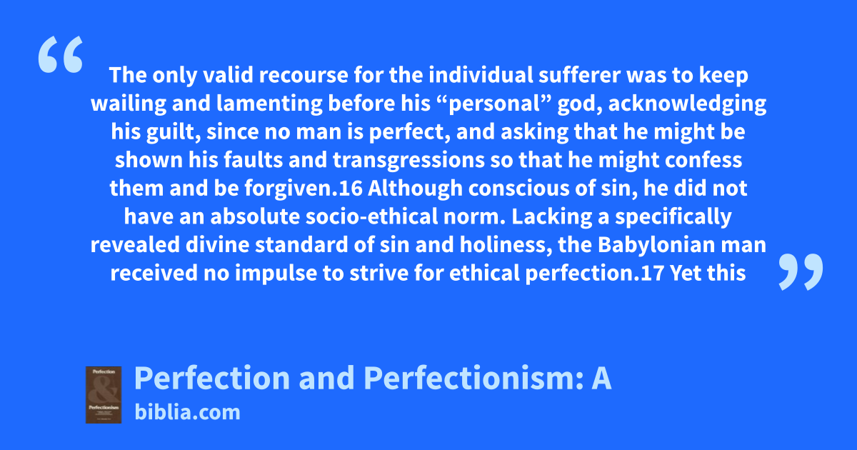The only valid recourse for the individual sufferer was to keep wailing and lamenting before his “personal” god, acknowledging his guilt, since no man is perfect, and asking that he might be shown his faults and transgressions so that he might confess them and be forgiven.16 Although conscious of sin, he did not have an absolute socio-ethical norm. Lacking a specifically revealed divine standard of sin and holiness, the Babylonian man received no impulse to strive for ethical perfection.17 Yet this
