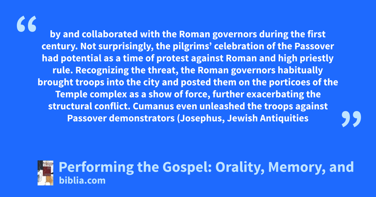 by and collaborated with the Roman governors during the first century. Not surprisingly, the pilgrims’ celebration of the Passover had potential as a time of protest against Roman and high priestly rule. Recognizing the threat, the Roman governors habitually brought troops into the city and posted them on the porticoes of the Temple complex as a show of force, further exacerbating the structural conflict. Cumanus even unleashed the troops against Passover demonstrators (Josephus, Jewish Antiquities