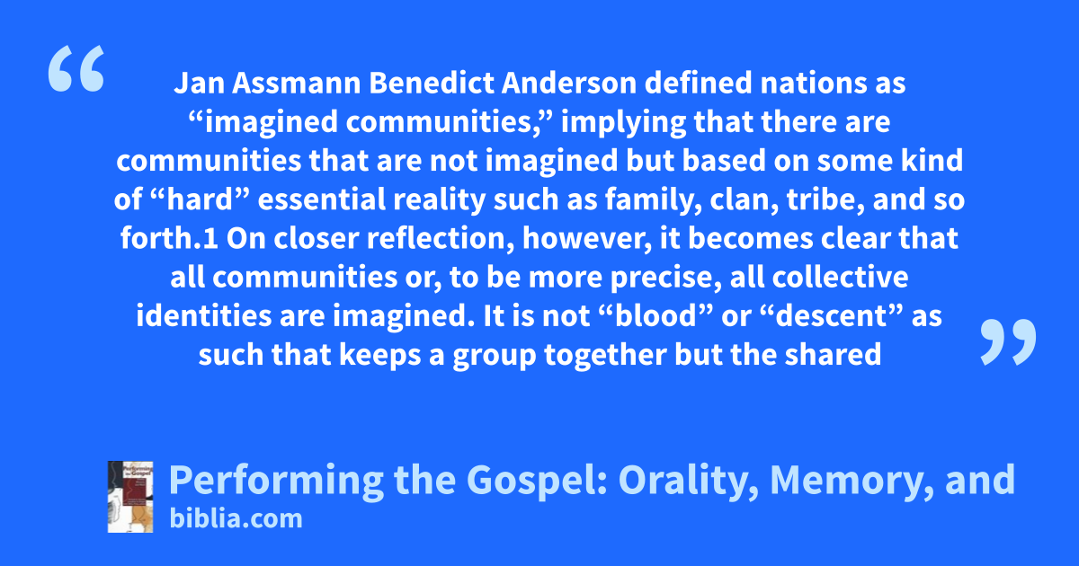 Jan Assmann Benedict Anderson defined nations as “imagined communities,” implying that there are communities that are not imagined but based on some kind of “hard” essential reality such as family, clan, tribe, and so forth.1 On closer reflection, however, it becomes clear that all communities or, to be more precise, all collective identities are imagined. It is not “blood” or “descent” as such that keeps a group together but the shared