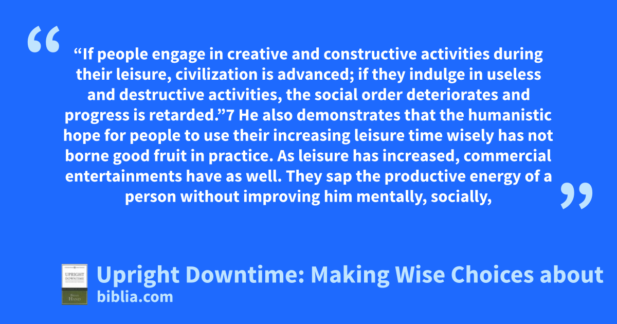 “If people engage in creative and constructive activities during their leisure, civilization is advanced; if they indulge in useless and destructive activities, the social order deteriorates and progress is retarded.”7 He also demonstrates that the humanistic hope for people to use their increasing leisure time wisely has not borne good fruit in practice. As leisure has increased, commercial entertainments have as well. They sap the productive energy of a person without improving him mentally, socially,