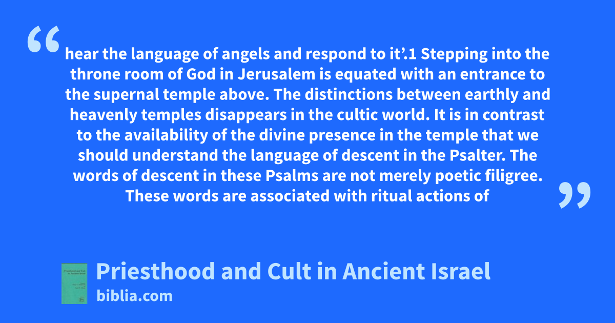 hear the language of angels and respond to it’.1 Stepping into the throne room of God in Jerusalem is equated with an entrance to the supernal temple above. The distinctions between earthly and heavenly temples disappears in the cultic world. It is in contrast to the availability of the divine presence in the temple that we should understand the language of descent in the Psalter. The words of descent in these Psalms are not merely poetic filigree. These words are associated with ritual actions of