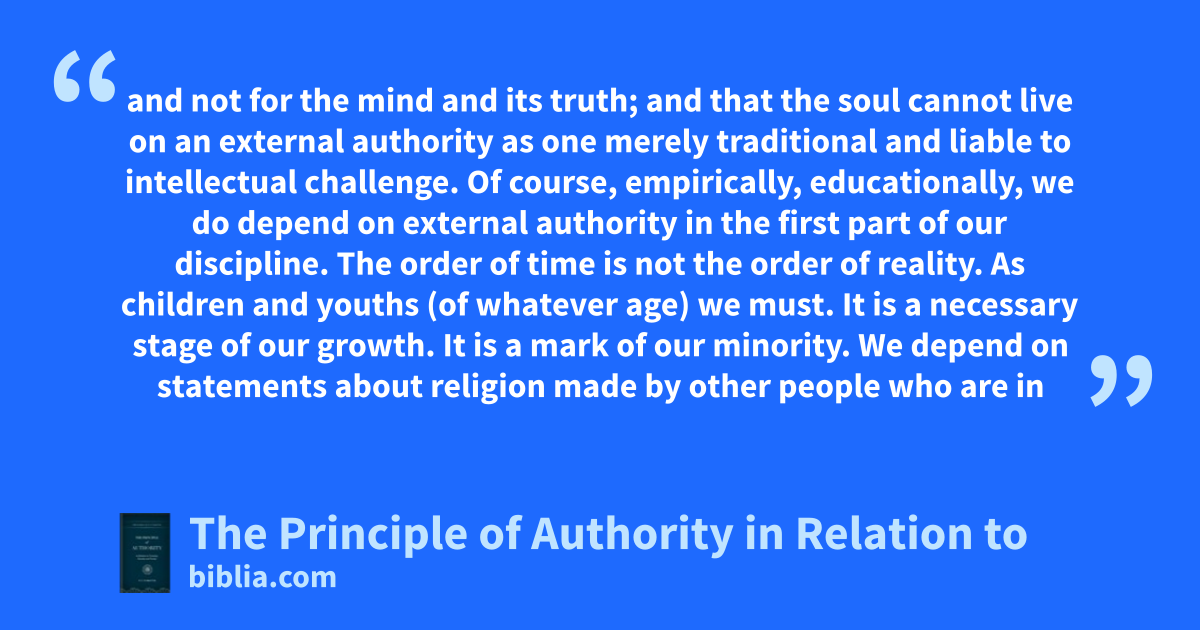 There is only one thing greater than liberty, and that is authority. The conviction in these pages is that the principle of authority is ultimately the whole religious question, that an authority of any practical kind draws its meaning and its right only from the soul’s relation to its God, and this is so not only for religion strictly so called, nor for a church, but for a public life, social...