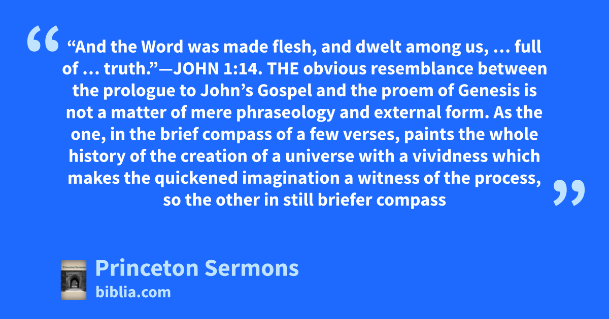 “And the Word was made flesh, and dwelt among us, … full of … truth.”—JOHN 1:14. THE obvious resemblance between the prologue to John’s Gospel and the proem of Genesis is not a matter of mere phraseology and external form. As the one, in the brief compass of a few verses, paints the whole history of the creation of a universe with a vividness which makes the quickened imagination a witness of the process, so the other in still briefer compass