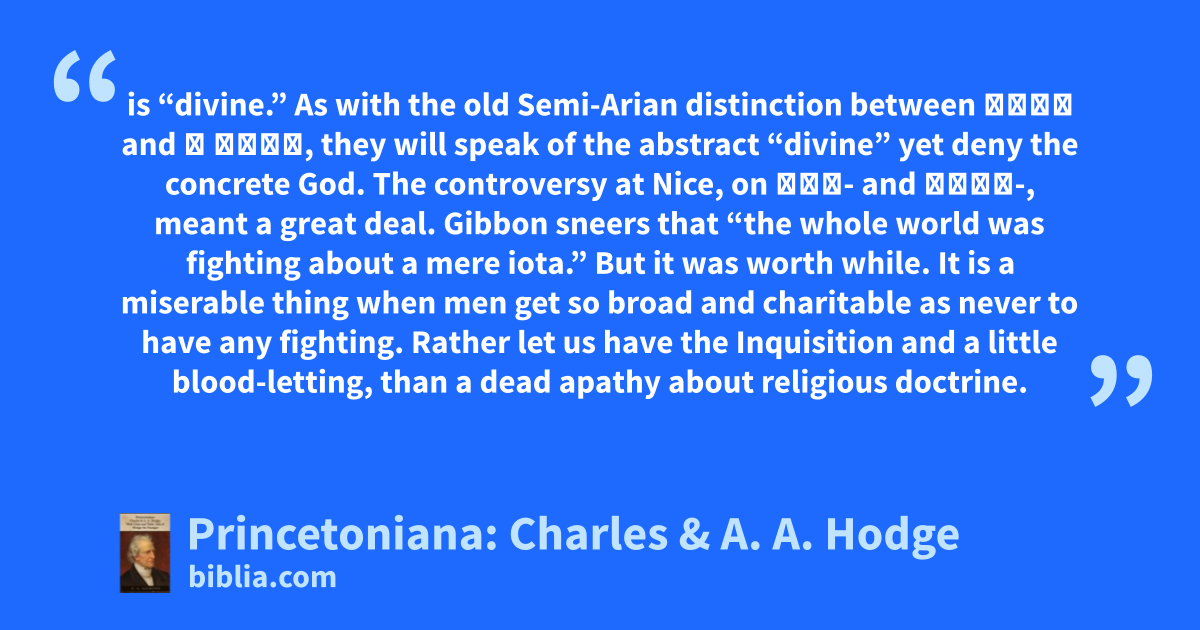 is “divine.” As with the old Semi-Arian distinction between θεός and ὁ θεός, they will speak of the abstract “divine” yet deny the concrete God. The controversy at Nice, on ὁμο- and ὁμοι-, meant a great deal. Gibbon sneers that “the whole world was fighting about a mere iota.” But it was worth while. It is a miserable thing when men get so broad and charitable as never to have any fighting. Rather let us have the Inquisition and a little blood-letting, than a dead apathy about religious doctrine.