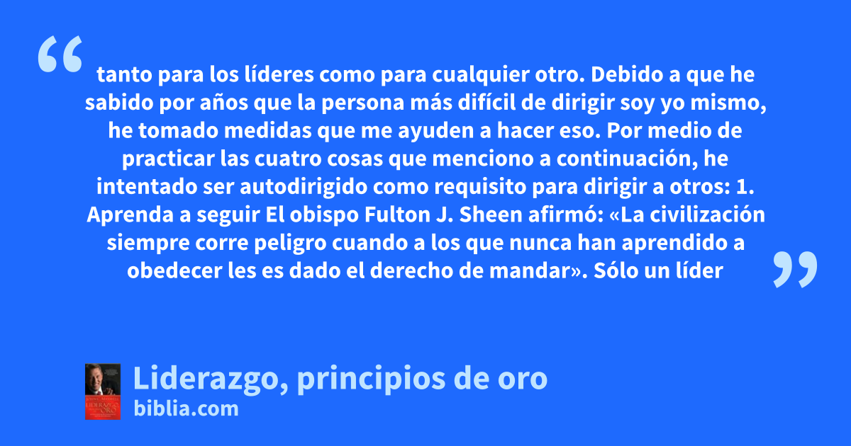 tanto para los líderes como para cualquier otro. Debido a que he sabido por años que la persona más difícil de dirigir soy yo mismo, he tomado medidas que me ayuden a hacer eso. Por medio de practicar las cuatro cosas que menciono a continuación, he intentado ser autodirigido como requisito para dirigir a otros: 1. Aprenda a seguir El obispo Fulton J. Sheen afirmó: «La civilización siempre corre peligro cuando a los que nunca han aprendido a obedecer les es dado el derecho de mandar». Sólo un líder