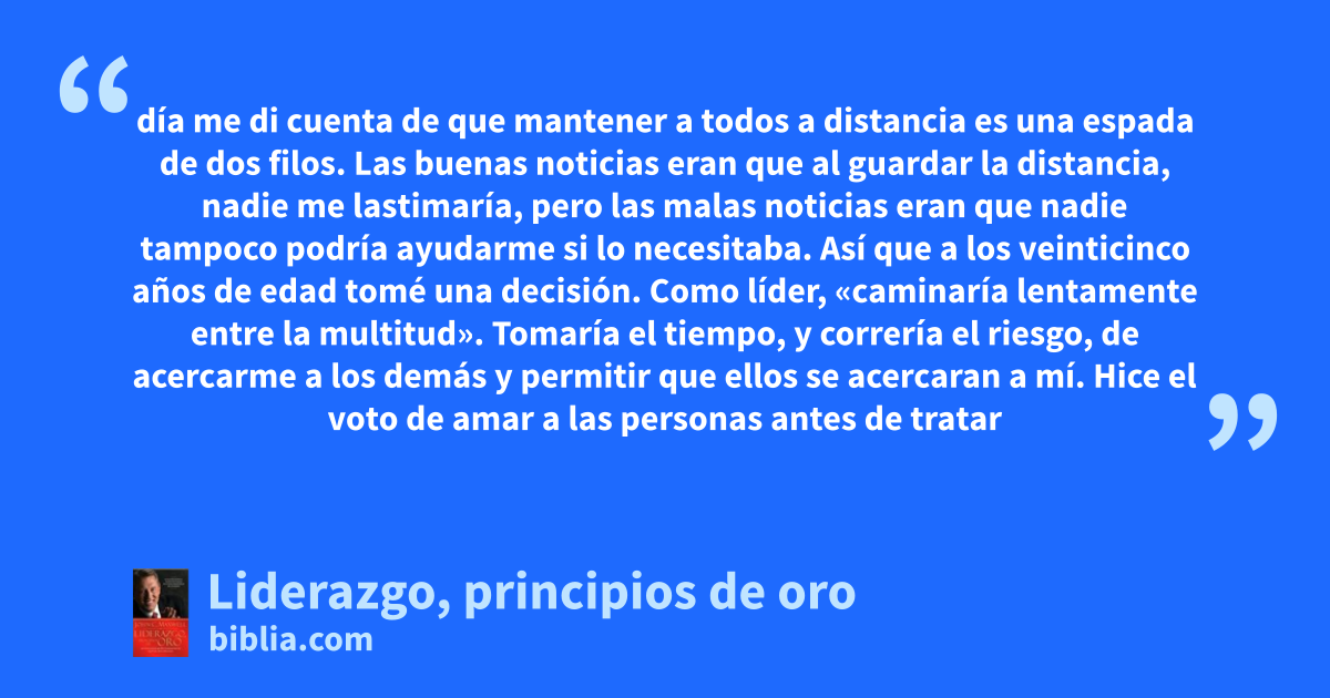 día me di cuenta de que mantener a todos a distancia es una espada de dos filos. Las buenas noticias eran que al guardar la distancia, nadie me lastimaría, pero las malas noticias eran que nadie tampoco podría ayudarme si lo necesitaba. Así que a los veinticinco años de edad tomé una decisión. Como líder, «caminaría lentamente entre la multitud». Tomaría el tiempo, y correría el riesgo, de acercarme a los demás y permitir que ellos se acercaran a mí. Hice el voto de amar a las personas antes de tratar