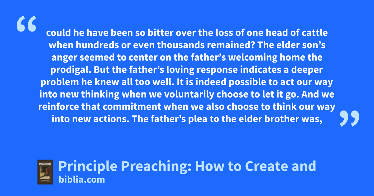 could he have been so bitter over the loss of one head of cattle when hundreds or even thousands remained? The elder son’s anger seemed to center on the father’s welcoming home the prodigal. But the father’s loving response indicates a deeper problem he knew all too well. It is indeed possible to act our way into new thinking when we voluntarily choose to let it go. And we reinforce that commitment when we also choose to think our way into new actions. The father’s plea to the elder brother was,