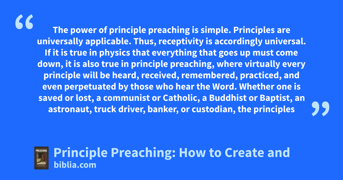 The power of principle preaching is simple. Principles are universally applicable. Thus, receptivity is accordingly universal. If it is true in physics that everything that goes up must come down, it is also true in principle preaching, where virtually every principle will be heard, received, remembered, practiced, and even perpetuated by those who hear the Word. Whether one is saved or lost, a communist or Catholic, a Buddhist or Baptist, an astronaut, truck driver, banker, or custodian, the principles