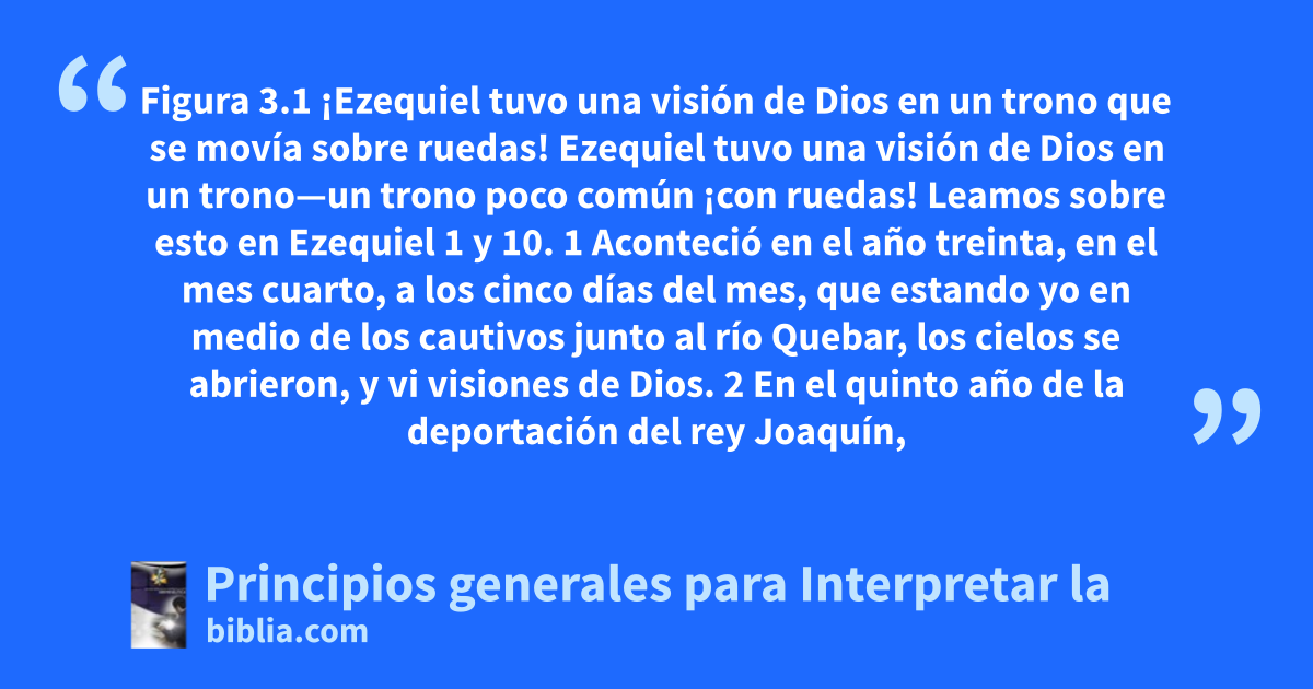 Figura 3.1 ¡Ezequiel tuvo una visión de Dios en un trono que se movía sobre ruedas! Ezequiel tuvo una visión de Dios en un trono—un trono poco común ¡con ruedas! Leamos sobre esto en Ezequiel 1 y 10. 1 Aconteció en el año treinta, en el mes cuarto, a los cinco días del mes, que estando yo en medio de los cautivos junto al río Quebar, los cielos se abrieron, y vi visiones de Dios. 2 En el quinto año de la deportación del rey Joaquín,