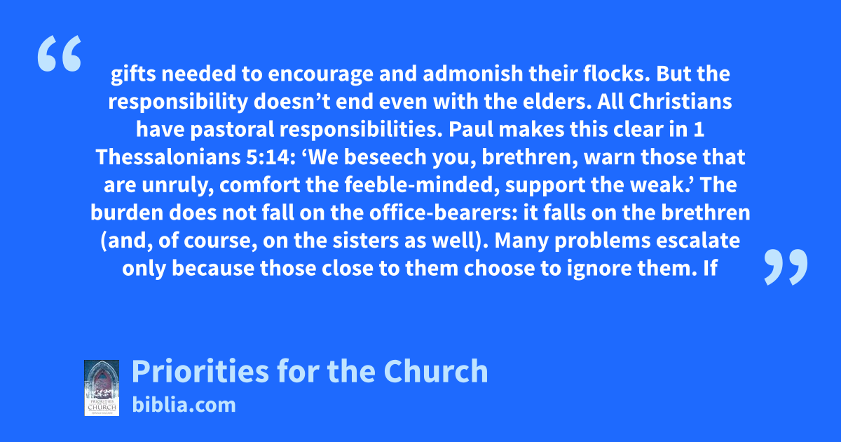 gifts needed to encourage and admonish their flocks. But the responsibility doesn’t end even with the elders. All Christians have pastoral responsibilities. Paul makes this clear in 1 Thessalonians 5:14: ‘We beseech you, brethren, warn those that are unruly, comfort the feeble-minded, support the weak.’ The burden does not fall on the office-bearers: it falls on the brethren (and, of course, on the sisters as well). Many problems escalate only because those close to them choose to ignore them. If