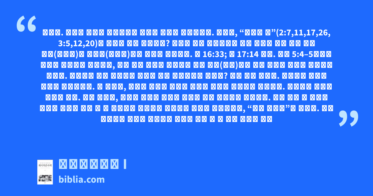 셈이다. 버가모 교회와 라오디게아 교회의 경우도 마찬가지다. 그러면, “이기는 자”(2:7,11,17,26, 3:5,12,20)란 말씀의 뜻이 무엇인가? 이것은 예수 그리스도의 승리 때문에 그의 안에 있는 자들(신자들)이 부전승(不戰勝)으로 이김을 가리킨다. 요 16:33; 계 17:14 참조. 요일 5:4–5에서는 믿음이 이긴다고 하였는데, 그것 역시 신자가 그리스도 안에 일체(一體)되어 있기 때문에 승리를 누린다는 뜻이다. 그렇다면 사람 편에서는 노력도 없이 승리한다는 것인가? 그런 것은 아니다. 하나님은 신자의 노력을 촉구하신다. 그 이유는, 인간된 신자가 기계나 물건이 아니고 인격이기 때문이다. 인격자는 노력할 책임이 있다. 그뿐 아니라, 노력은 인간의 공로가 아니고 그의 진실성의 증표이다. 손이 말라 그 기능이 마비된 인간이 손을 펼 수 없음에도 불구하고 예수님은 그에게 명하시기를, “손을 내밀라”고 하셨다. 그가 순종하는 순간에 예수님은 그에게 손을 펼 수 있는 능력을 주셨