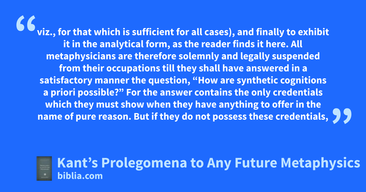 viz., for that which is sufficient for all cases), and finally to exhibit it in the analytical form, as the reader finds it here. All metaphysicians are therefore solemnly and legally suspended from their occupations till they shall have answered in a satisfactory manner the question, “How are synthetic cognitions a priori possible?” For the answer contains the only credentials which they must show when they have anything to offer in the name of pure reason. But if they do not possess these credentials,