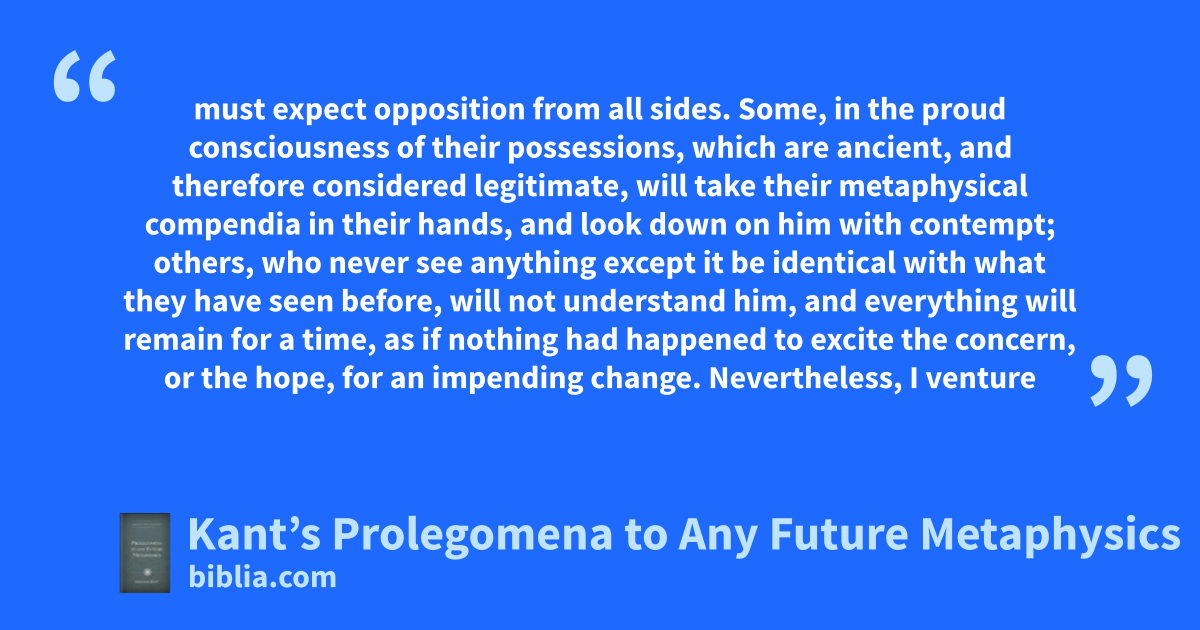 must expect opposition from all sides. Some, in the proud consciousness of their possessions, which are ancient, and therefore considered legitimate, will take their metaphysical compendia in their hands, and look down on him with contempt; others, who never see anything except it be identical with what they have seen before, will not understand him, and everything will remain for a time, as if nothing had happened to excite the concern, or the hope, for an impending change. Nevertheless, I venture