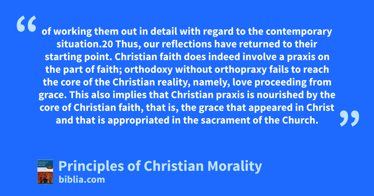 of working them out in detail with regard to the contemporary situation.20 Thus, our reflections have returned to their starting point. Christian faith does indeed involve a praxis on the part of faith; orthodoxy without orthopraxy fails to reach the core of the Christian reality, namely, love proceeding from grace. This also implies that Christian praxis is nourished by the core of Christian faith, that is, the grace that appeared in Christ and that is appropriated in the sacrament of the Church.