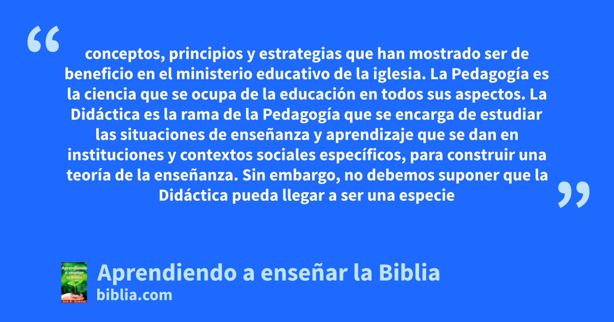 conceptos, principios y estrategias que han mostrado ser de beneficio en el ministerio educativo de la iglesia. La Pedagogía es la ciencia que se ocupa de la educación en todos sus aspectos. La Didáctica es la rama de la Pedagogía que se encarga de estudiar las situaciones de enseñanza y aprendizaje que se dan en instituciones y contextos sociales específicos, para construir una teoría de la enseñanza. Sin embargo, no debemos suponer que la Didáctica pueda llegar a ser una especie