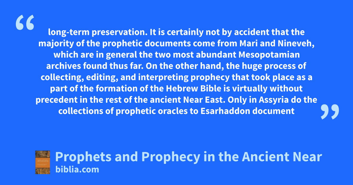 long-term preservation. It is certainly not by accident that the majority of the prophetic documents come from Mari and Nineveh, which are in general the two most abundant Mesopotamian archives found thus far. On the other hand, the huge process of collecting, editing, and interpreting prophecy that took place as a part of the formation of the Hebrew Bible is virtually without precedent in the rest of the ancient Near East. Only in Assyria do the collections of prophetic oracles to Esarhaddon document