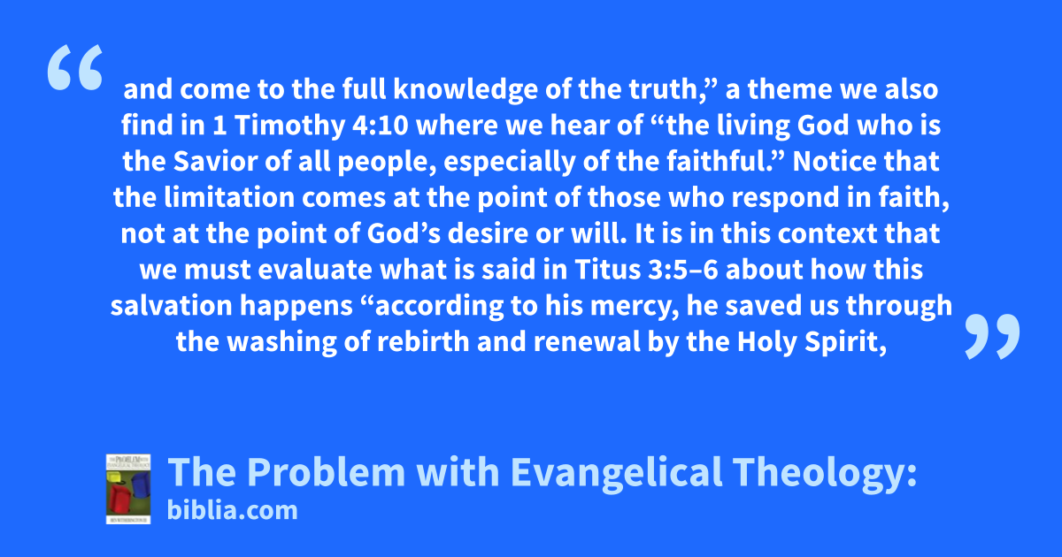 and come to the full knowledge of the truth,” a theme we also find in 1 Timothy 4:10 where we hear of “the living God who is the Savior of all people, especially of the faithful.” Notice that the limitation comes at the point of those who respond in faith, not at the point of God’s desire or will. It is in this context that we must evaluate what is said in Titus 3:5–6 about how this salvation happens “according to his mercy, he saved us through the washing of rebirth and renewal by the Holy Spirit,