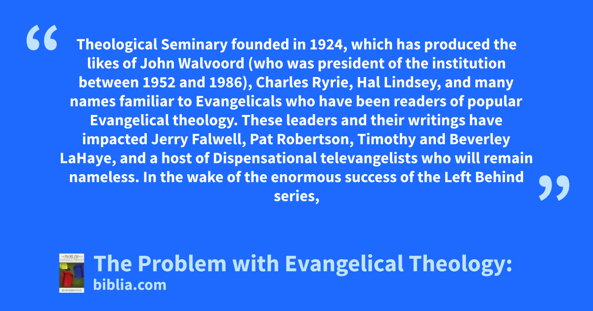 Theological Seminary founded in 1924, which has produced the likes of John Walvoord (who was president of the institution between 1952 and 1986), Charles Ryrie, Hal Lindsey, and many names familiar to Evangelicals who have been readers of popular Evangelical theology. These leaders and their writings have impacted Jerry Falwell, Pat Robertson, Timothy and Beverley LaHaye, and a host of Dispensational televangelists who will remain nameless. In the wake of the enormous success of the Left Behind series,