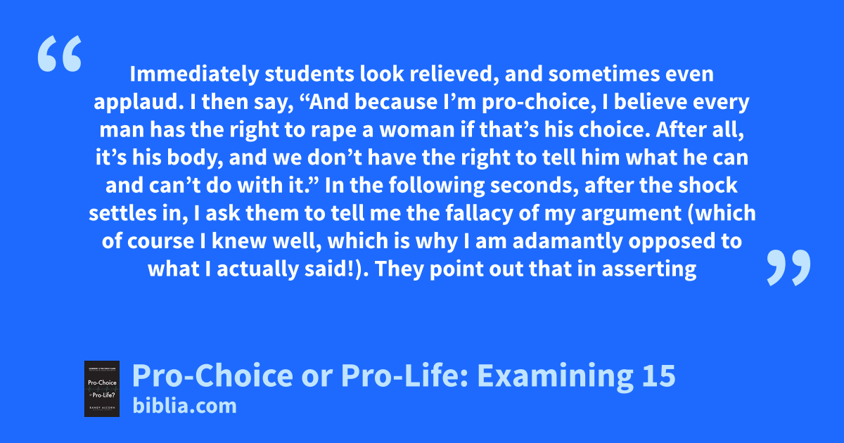 Immediately students look relieved, and sometimes even applaud. I then say, “And because I’m pro-choice, I believe every man has the right to rape a woman if that’s his choice. After all, it’s his body, and we don’t have the right to tell him what he can and can’t do with it.” In the following seconds, after the shock settles in, I ask them to tell me the fallacy of my argument (which of course I knew well, which is why I am adamantly opposed to what I actually said!). They point out that in asserting