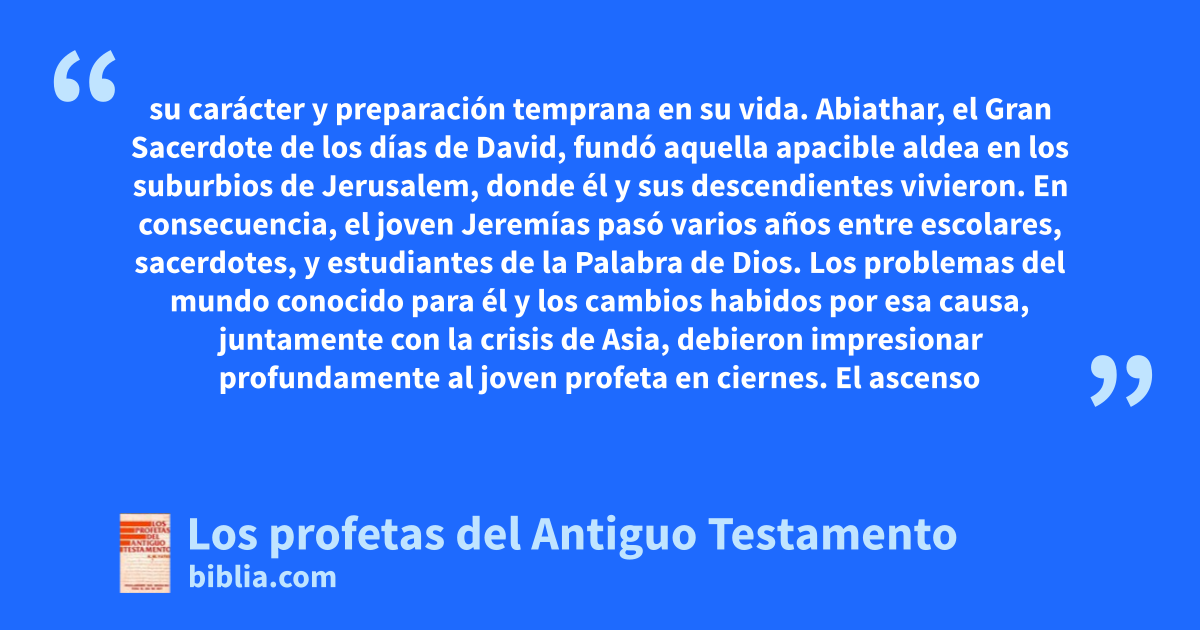 su carácter y preparación temprana en su vida. Abiathar, el Gran Sacerdote de los días de David, fundó aquella apacible aldea en los suburbios de Jerusalem, donde él y sus descendientes vivieron. En consecuencia, el joven Jeremías pasó varios años entre escolares, sacerdotes, y estudiantes de la Palabra de Dios. Los problemas del mundo conocido para él y los cambios habidos por esa causa, juntamente con la crisis de Asia, debieron impresionar profundamente al joven profeta en ciernes. El ascenso