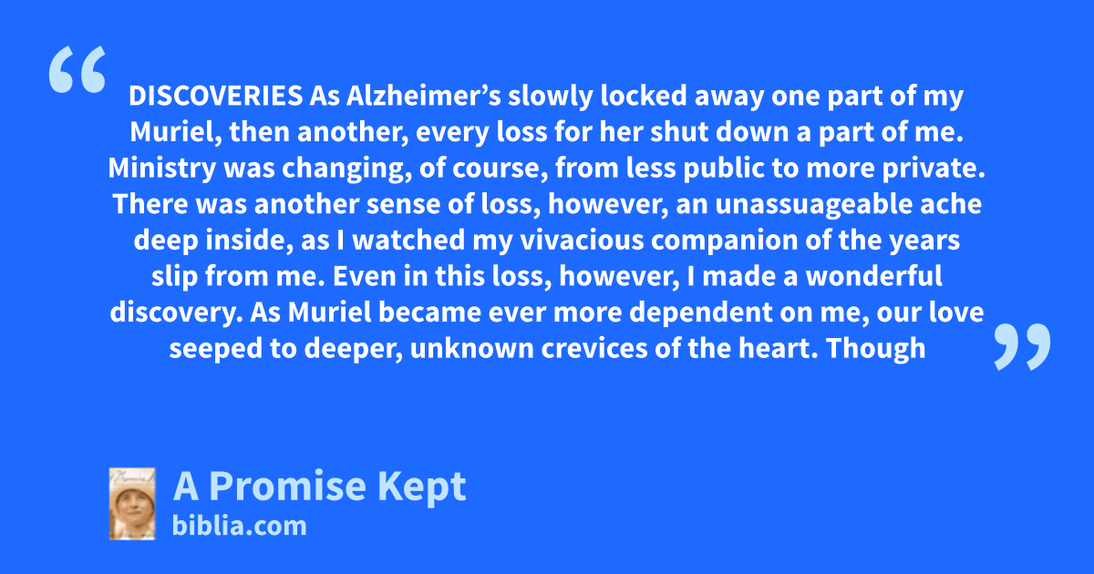 DISCOVERIES As Alzheimer’s slowly locked away one part of my Muriel, then another, every loss for her shut down a part of me. Ministry was changing, of course, from less public to more private. There was another sense of loss, however, an unassuageable ache deep inside, as I watched my vivacious companion of the years slip from me. Even in this loss, however, I made a wonderful discovery. As Muriel became ever more dependent on me, our love seeped to deeper, unknown crevices of the heart. Though