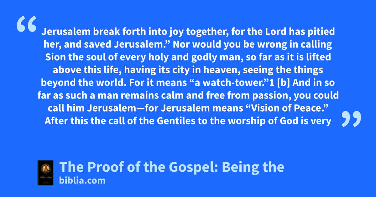 Jerusalem break forth into joy together, for the Lord has pitied her, and saved Jerusalem.” Nor would you be wrong in calling Sion the soul of every holy and godly man, so far as it is lifted above this life, having its city in heaven, seeing the things beyond the world. For it means “a watch-tower.”1 [b] And in so far as such a man remains calm and free from passion, you could call him Jerusalem—for Jerusalem means “Vision of Peace.” After this the call of the Gentiles to the worship of God is very