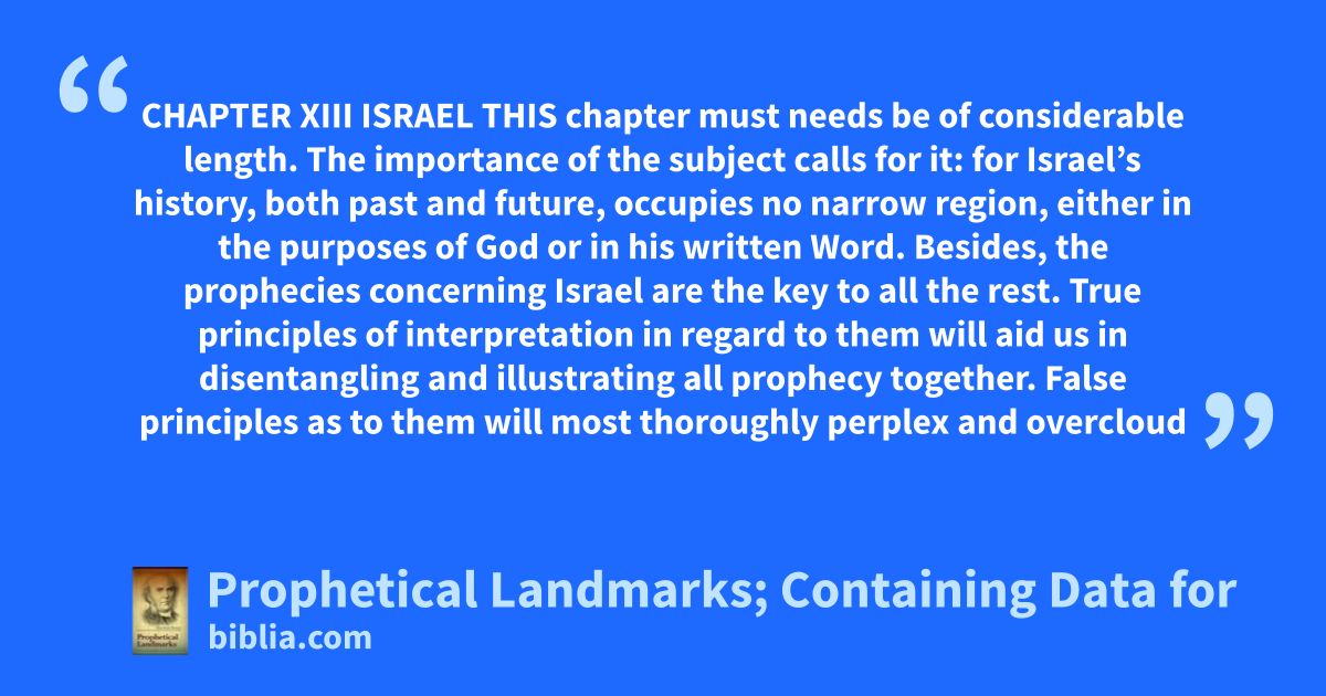 CHAPTER XIII ISRAEL THIS chapter must needs be of considerable length. The importance of the subject calls for it: for Israel’s history, both past and future, occupies no narrow region, either in the purposes of God or in his written Word. Besides, the prophecies concerning Israel are the key to all the rest. True principles of interpretation in regard to them will aid us in disentangling and illustrating all prophecy together. False principles as to them will most thoroughly perplex and overcloud