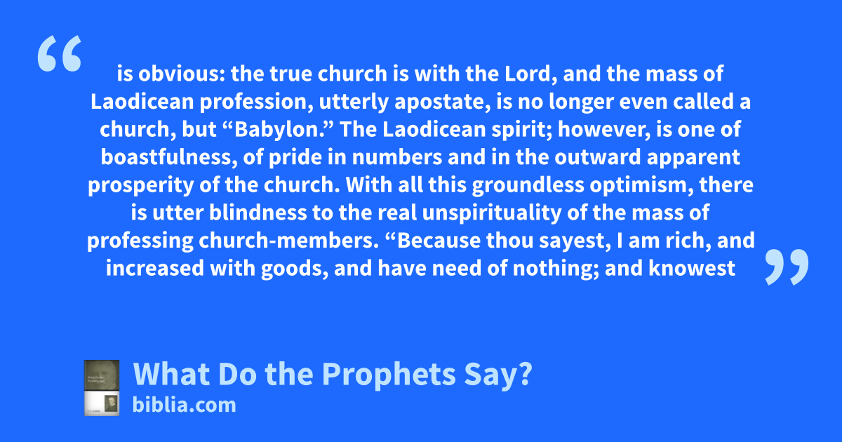 is obvious: the true church is with the Lord, and the mass of Laodicean profession, utterly apostate, is no longer even called a church, but “Babylon.” The Laodicean spirit; however, is one of boastfulness, of pride in numbers and in the outward apparent prosperity of the church. With all this groundless optimism, there is utter blindness to the real unspirituality of the mass of professing church-members. “Because thou sayest, I am rich, and increased with goods, and have need of nothing; and knowest