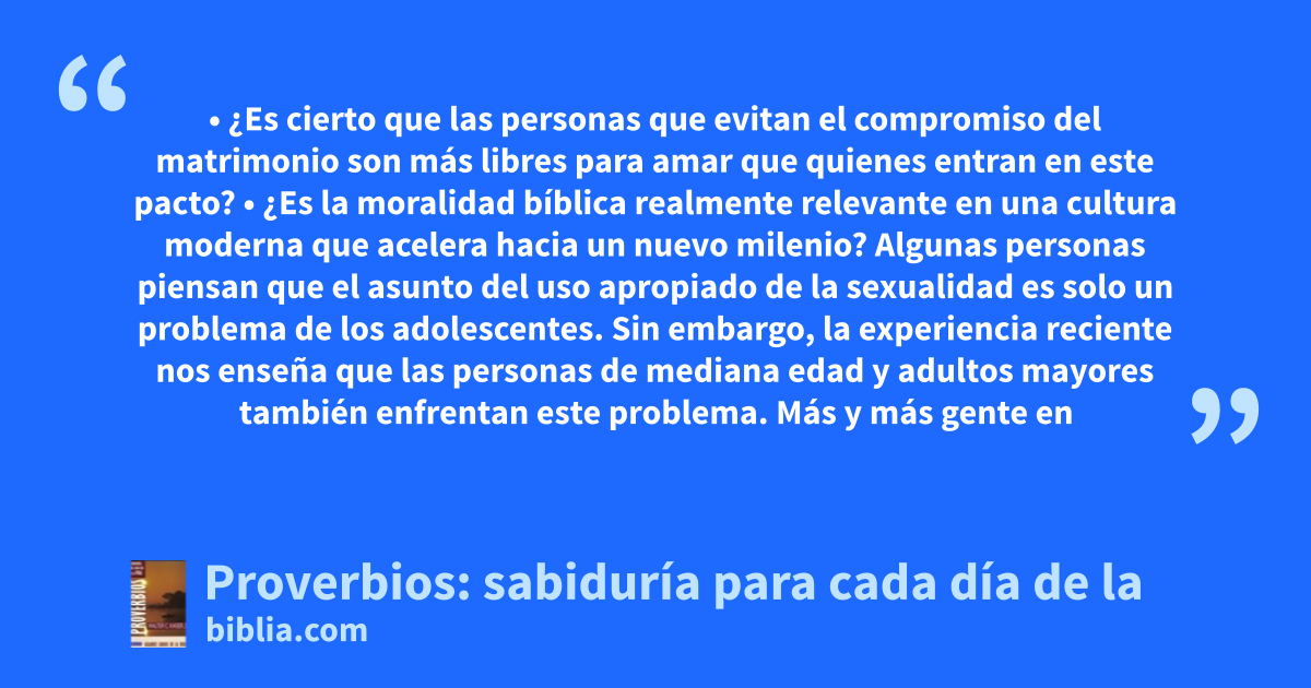 • ¿Es cierto que las personas que evitan el compromiso del matrimonio son más libres para amar que quienes entran en este pacto? • ¿Es la moralidad bíblica realmente relevante en una cultura moderna que acelera hacia un nuevo milenio? Algunas personas piensan que el asunto del uso apropiado de la sexualidad es solo un problema de los adolescentes. Sin embargo, la experiencia reciente nos enseña que las personas de mediana edad y adultos mayores también enfrentan este problema. Más y más gente en