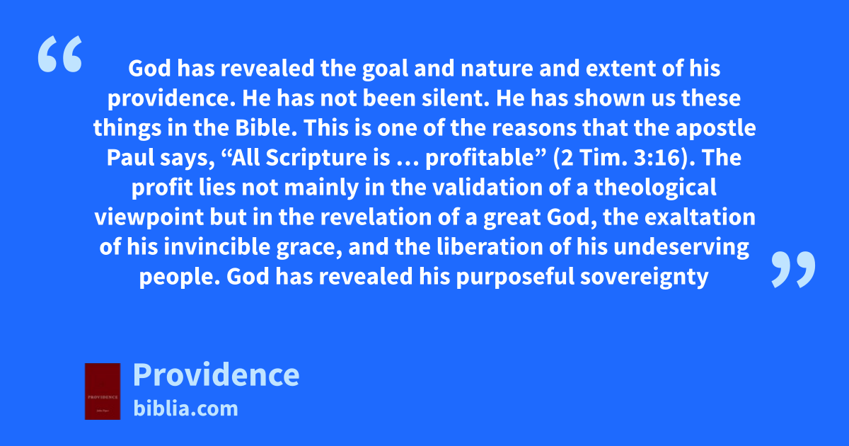 God has revealed the goal and nature and extent of his providence. He has not been silent. He has shown us these things in the Bible. This is one of the reasons that the apostle Paul says, “All Scripture is … profitable” (2 Tim. 3:16). The profit lies not mainly in the validation of a theological viewpoint but in the revelation of a great God, the exaltation of his invincible grace, and the liberation of his undeserving people. God has revealed his purposeful sovereignty