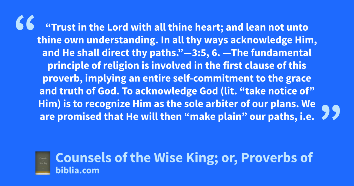“Trust in the Lord with all thine heart; and lean not unto thine own understanding. In all thy ways acknowledge Him, and He shall direct thy paths.”—3:5, 6. —The fundamental principle of religion is involved in the first clause of this proverb, implying an entire self-commitment to the grace and truth of God. To acknowledge God (lit. “take notice of” Him) is to recognize Him as the sole arbiter of our plans. We are promised that He will then “make plain” our paths, i.e.