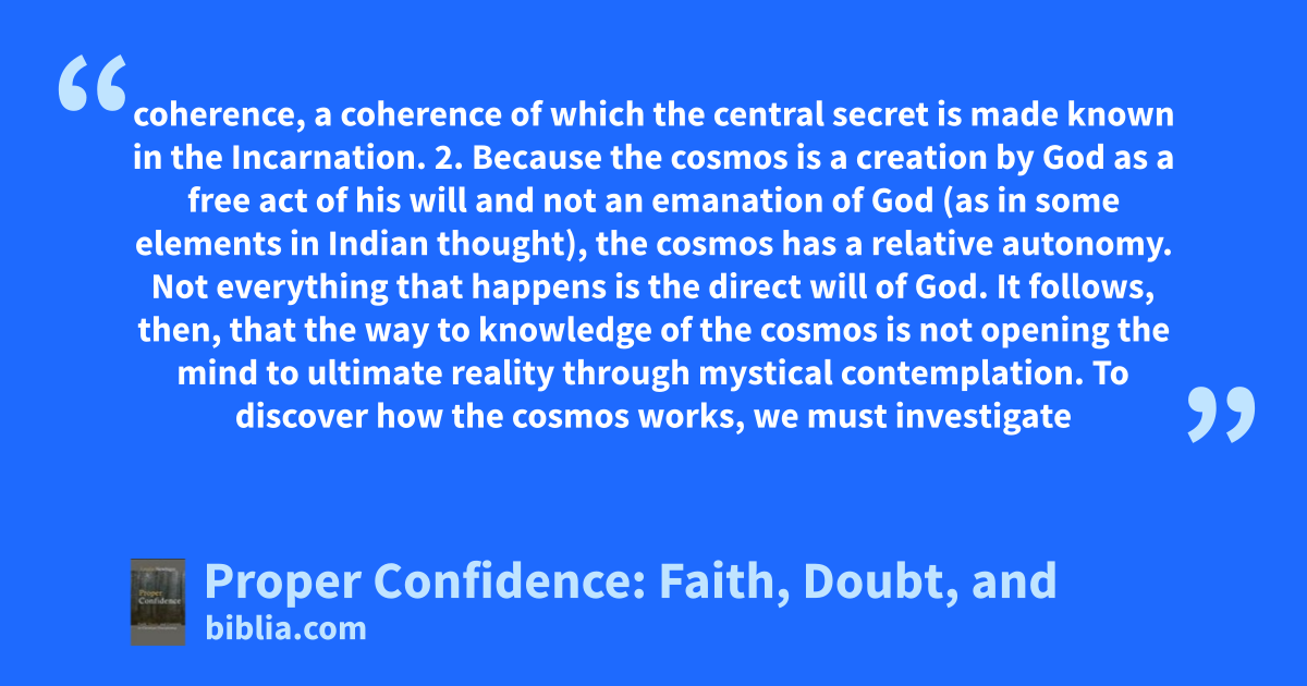 coherence, a coherence of which the central secret is made known in the Incarnation. 2. Because the cosmos is a creation by God as a free act of his will and not an emanation of God (as in some elements in Indian thought), the cosmos has a relative autonomy. Not everything that happens is the direct will of God. It follows, then, that the way to knowledge of the cosmos is not opening the mind to ultimate reality through mystical contemplation. To discover how the cosmos works, we must investigate