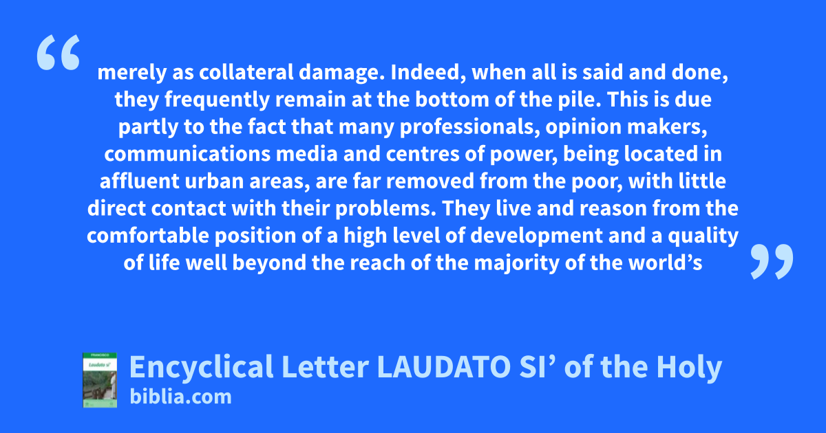merely as collateral damage. Indeed, when all is said and done, they frequently remain at the bottom of the pile. This is due partly to the fact that many professionals, opinion makers, communications media and centres of power, being located in affluent urban areas, are far removed from the poor, with little direct contact with their problems. They live and reason from the comfortable position of a high level of development and a quality of life well beyond the reach of the majority of the world’s