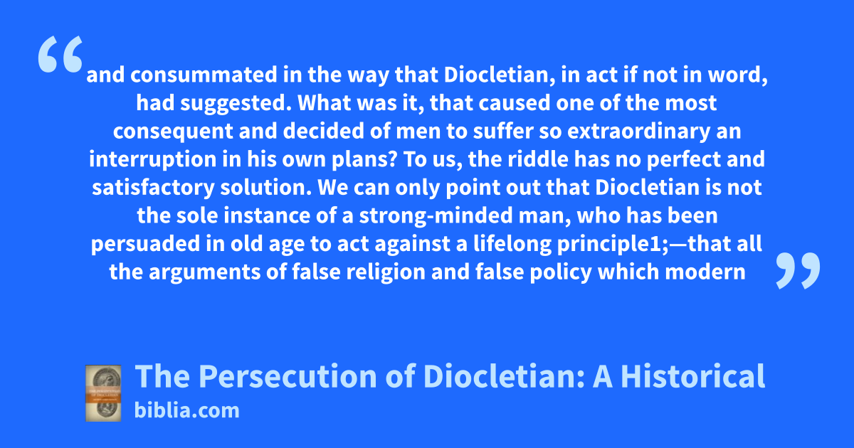 and consummated in the way that Diocletian, in act if not in word, had suggested. What was it, that caused one of the most consequent and decided of men to suffer so extraordinary an interruption in his own plans? To us, the riddle has no perfect and satisfactory solution. We can only point out that Diocletian is not the sole instance of a strong-minded man, who has been persuaded in old age to act against a lifelong principle1;—that all the arguments of false religion and false policy which modern
