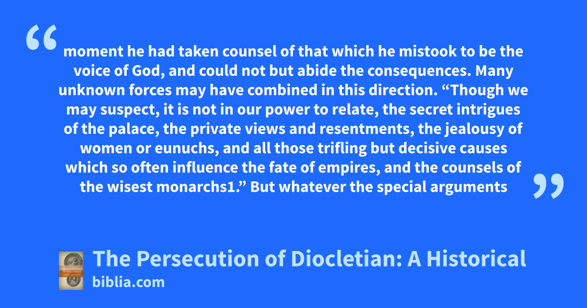 moment he had taken counsel of that which he mistook to be the voice of God, and could not but abide the consequences. Many unknown forces may have combined in this direction. “Though we may suspect, it is not in our power to relate, the secret intrigues of the palace, the private views and resentments, the jealousy of women or eunuchs, and all those trifling but decisive causes which so often influence the fate of empires, and the counsels of the wisest monarchs1.” But whatever the special arguments