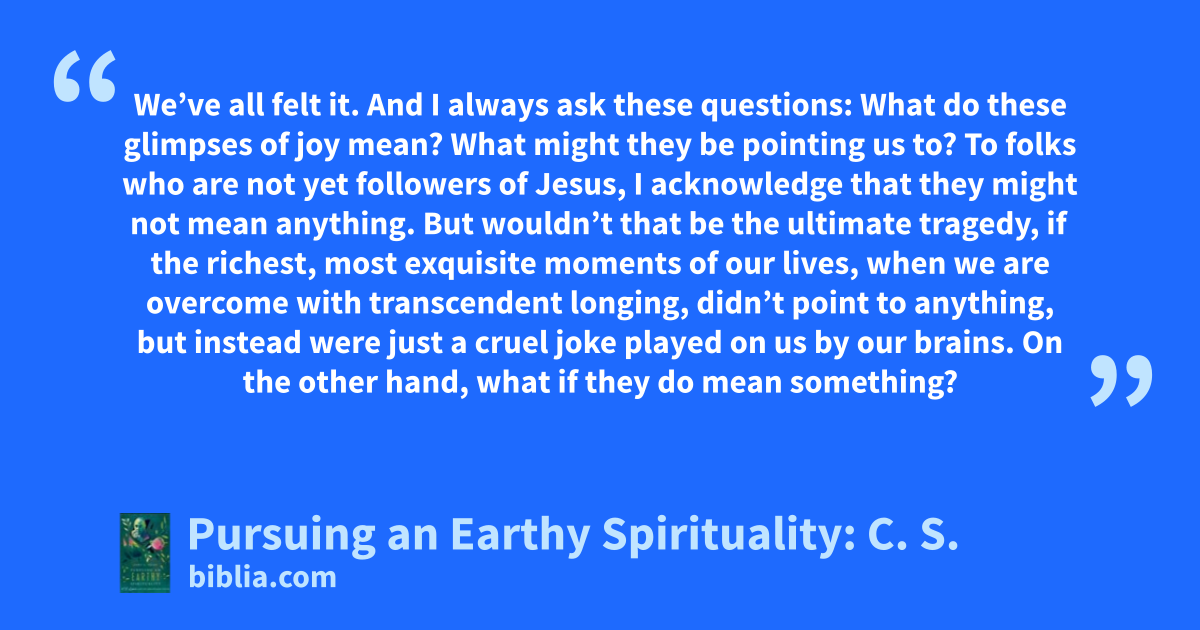 We’ve all felt it. And I always ask these questions: What do these glimpses of joy mean? What might they be pointing us to? To folks who are not yet followers of Jesus, I acknowledge that they might not mean anything. But wouldn’t that be the ultimate tragedy, if the richest, most exquisite moments of our lives, when we are overcome with transcendent longing, didn’t point to anything, but instead were just a cruel joke played on us by our brains. On the other hand, what if they do mean something?