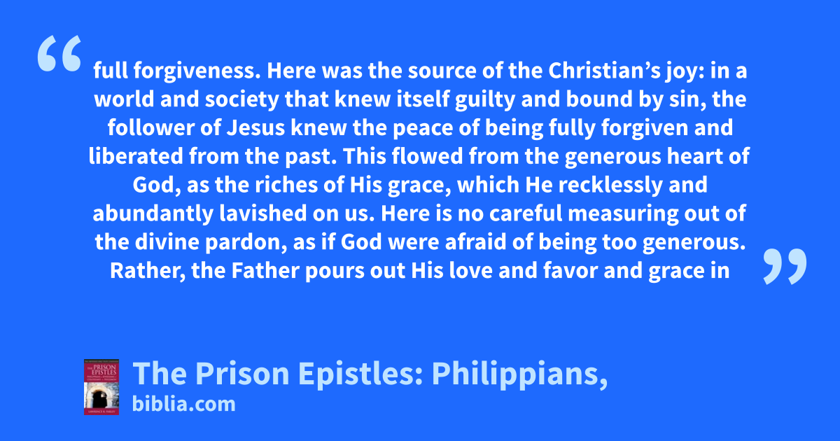 full forgiveness. Here was the source of the Christian’s joy: in a world and society that knew itself guilty and bound by sin, the follower of Jesus knew the peace of being fully forgiven and liberated from the past. This flowed from the generous heart of God, as the riches of His grace, which He recklessly and abundantly lavished on us. Here is no careful measuring out of the divine pardon, as if God were afraid of being too generous. Rather, the Father pours out His love and favor and grace in