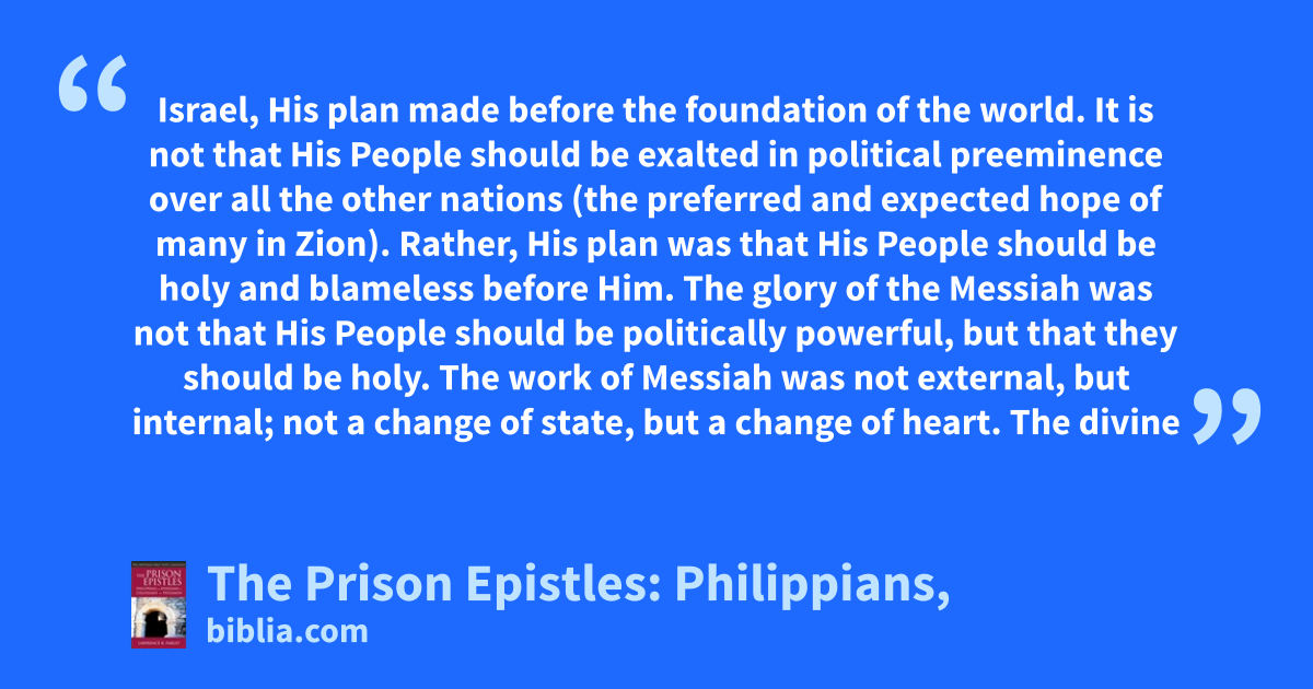 Israel, His plan made before the foundation of the world. It is not that His People should be exalted in political preeminence over all the other nations (the preferred and expected hope of many in Zion). Rather, His plan was that His People should be holy and blameless before Him. The glory of the Messiah was not that His People should be politically powerful, but that they should be holy. The work of Messiah was not external, but internal; not a change of state, but a change of heart. The divine