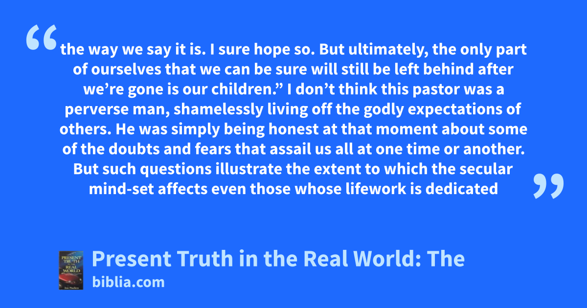 the way we say it is. I sure hope so. But ultimately, the only part of ourselves that we can be sure will still be left behind after we’re gone is our children.” I don’t think this pastor was a perverse man, shamelessly living off the godly expectations of others. He was simply being honest at that moment about some of the doubts and fears that assail us all at one time or another. But such questions illustrate the extent to which the secular mind-set affects even those whose lifework is dedicated