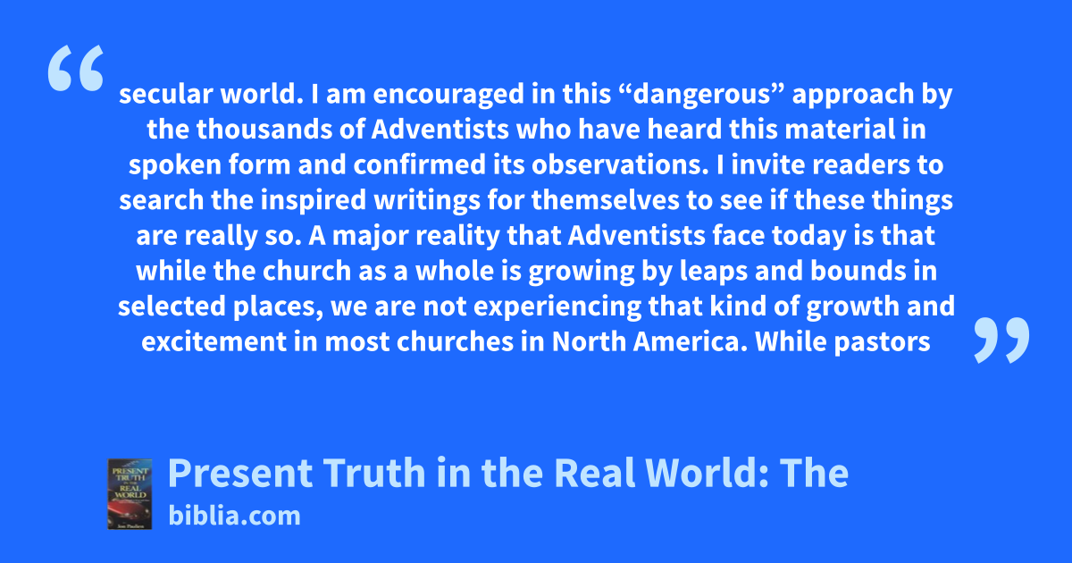 secular world. I am encouraged in this “dangerous” approach by the thousands of Adventists who have heard this material in spoken form and confirmed its observations. I invite readers to search the inspired writings for themselves to see if these things are really so. A major reality that Adventists face today is that while the church as a whole is growing by leaps and bounds in selected places, we are not experiencing that kind of growth and excitement in most churches in North America. While pastors