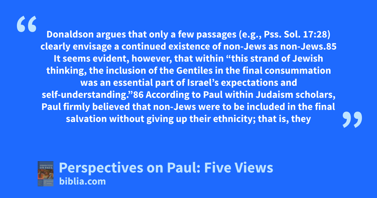 Donaldson argues that only a few passages (e.g., Pss. Sol. 17:28) clearly envisage a continued existence of non-Jews as non-Jews.85 It seems evident, however, that within “this strand of Jewish thinking, the inclusion of the Gentiles in the final consummation was an essential part of Israel’s expectations and self-understanding.”86 According to Paul within Judaism scholars, Paul firmly believed that non-Jews were to be included in the final salvation without giving up their ethnicity; that is, they