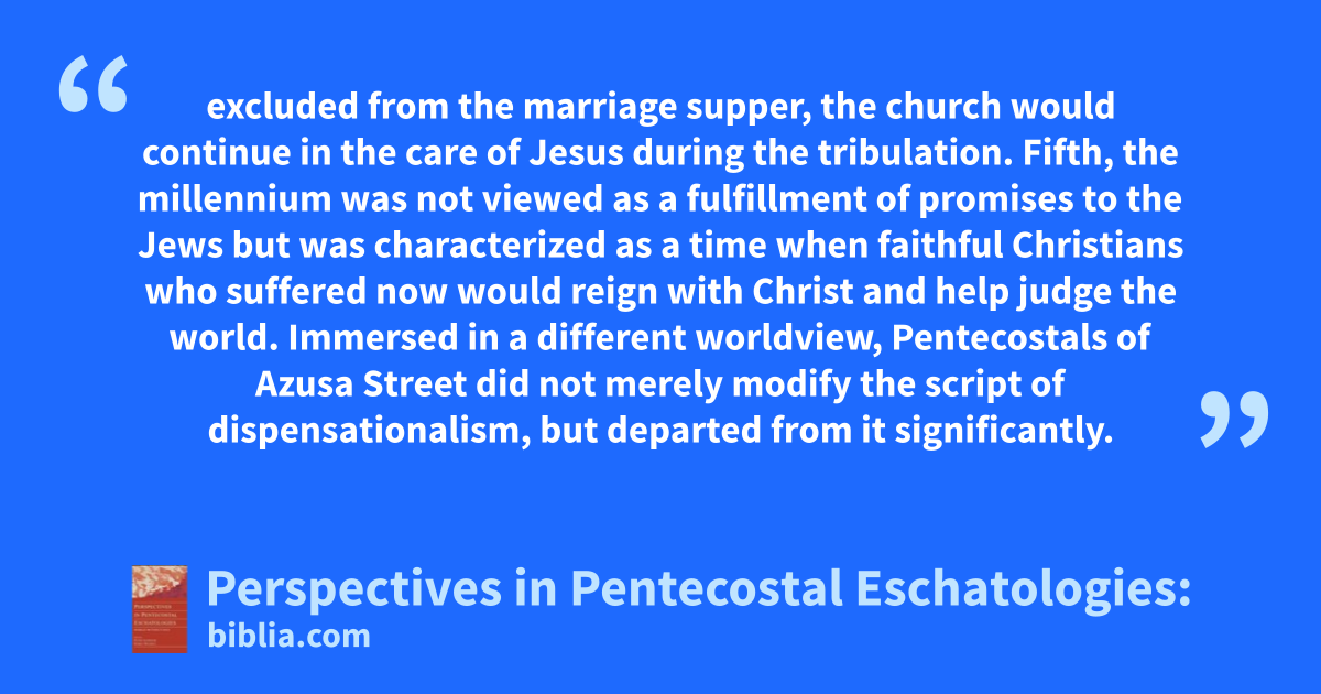 During the mid-twentieth century Pentecostal theology was co-opted by fundamentalism and its dispensational brand of millennial eschatology. Fundamentalist dispensationalism not only reinterpreted the original Pentecostal vision of the latter-rain outpouring of the Spirit in the last days but undercut its raison d’etre as a people empowered by the Spirit of Pentecost to participate in the kingdom...