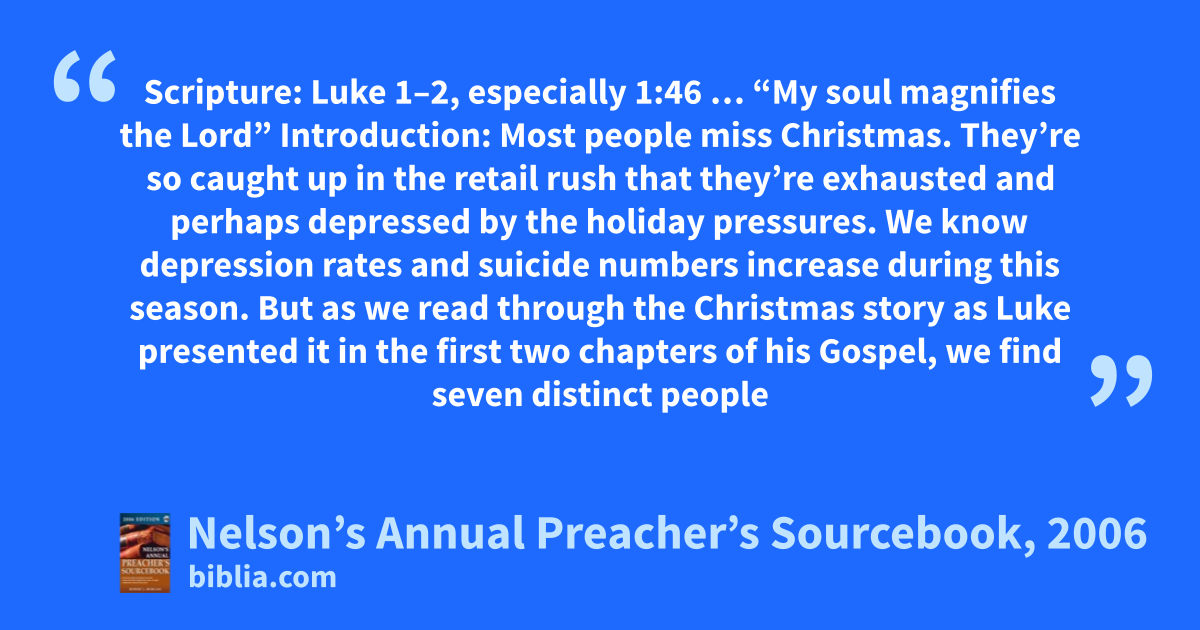 Scripture: Luke 1–2, especially 1:46 … “My soul magnifies the Lord” Introduction: Most people miss Christmas. They’re so caught up in the retail rush that they’re exhausted and perhaps depressed by the holiday pressures. We know depression rates and suicide numbers increase during this season. But as we read through the Christmas story as Luke presented it in the first two chapters of his Gospel, we find seven distinct people